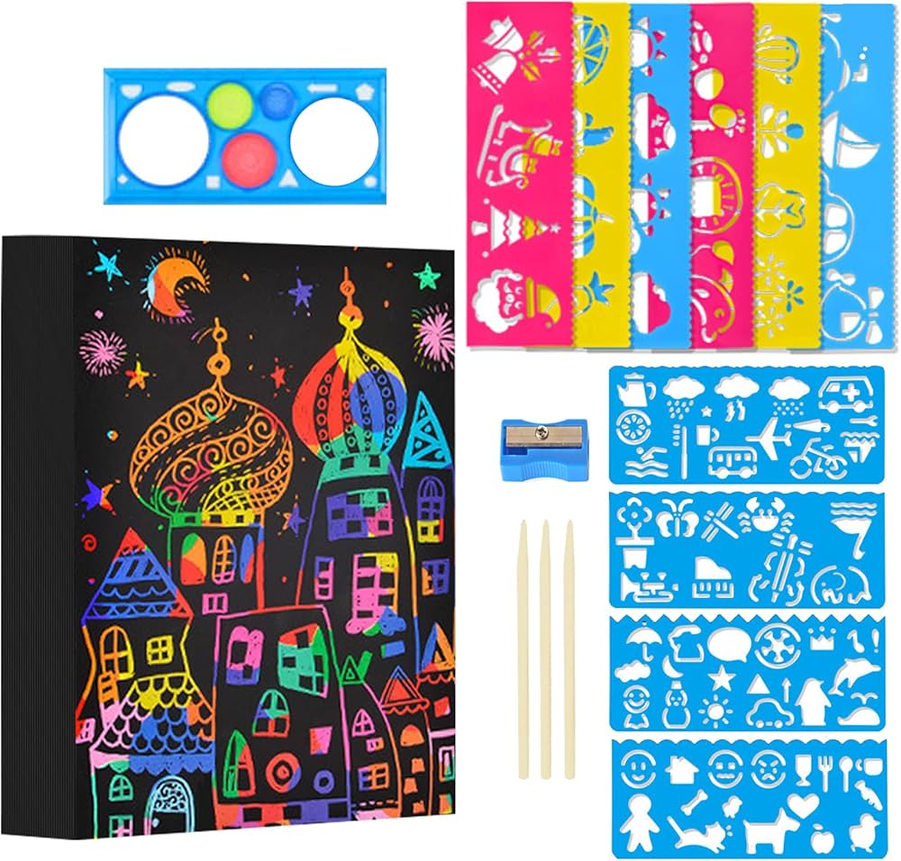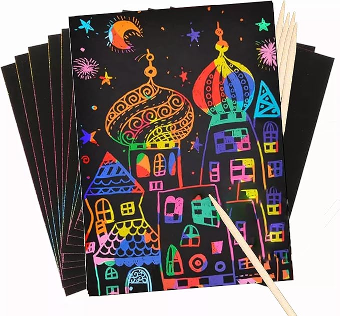 اكتشفوا متعة الرسم بالخدش مع هذا الكتاب الإبداعي المدهش! يعتمد هذا الكتاب على تقنية فنية فريدة حيث يمكن للأطفال إظهار الألوان والرسومات المخفية عن طريق خدش السطح الأسود ليكشفوا عن الألوان الزاهية أسفلها. 💫